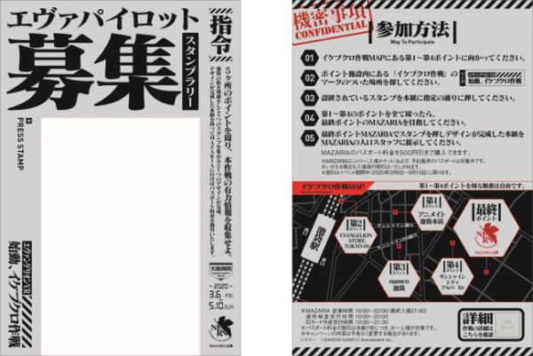 「エヴァパイロット募集スタンプラリー」は、池袋エリア5施設に設置したスタンプを集められたお客さまに対して、MAZARIAのパスポートの価格を500円割引するスタンプラリーです。