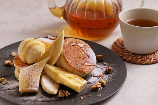 米粉で作るしっとりふわふわ生地のパンケーキに、優しい甘みの和素材をトッピング。