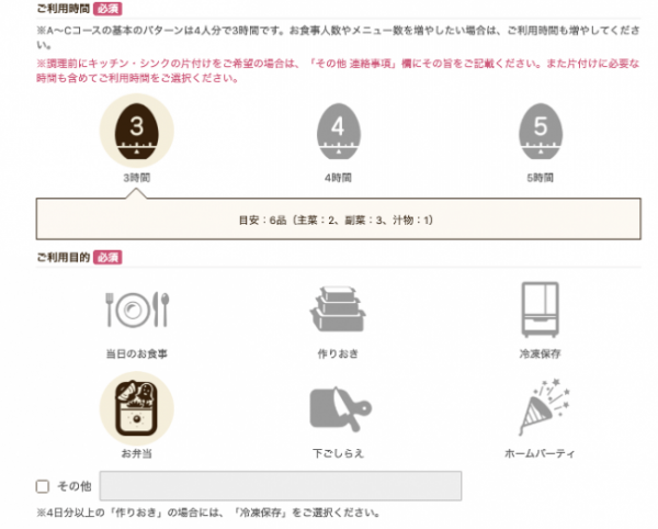 5)ご利用時間は「3時間」を、ご利用目的は「お弁当」を選択。