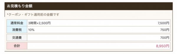 料金:3時間で定価7,500円のところ、4割引の4,500円(税抜き、交通費・指名料別)