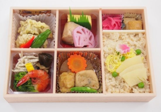 花びらしんじょうと木の芽をのせた筍ご飯。一口昆布巻や玉子焼き、煮物などを一折に詰め合わせました