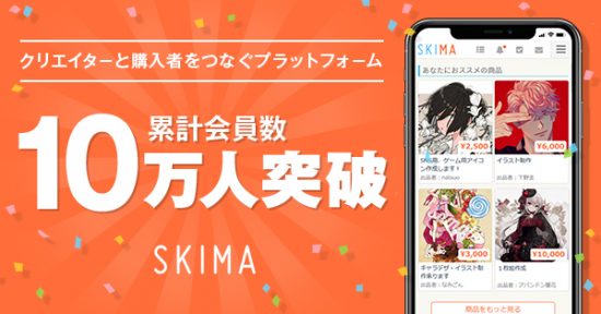 イラストのオーダーメイドマーケット「SKIMA」では、匿名性を確保した上で依頼ができる点や、クリエイターが主体となり価格や条件を設定できるなど、クリエイターと購入者の双方が安全・安心に取引ができるという点で大変ご好評をいただいており、この度累計会員数が10万人を突破いたしました。